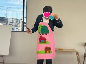 エプロンシアター「三匹のこぶた」 エプロンシアター「3匹のこぶた」と積み木シアター「大きなカバー」集中して見ていました。